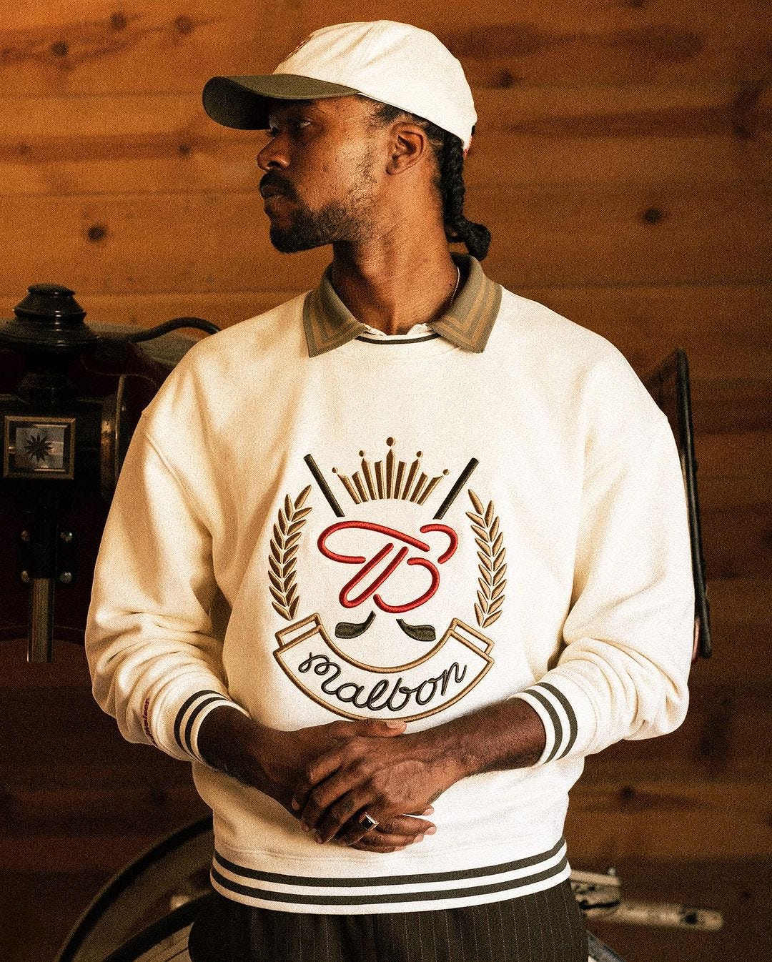 Taking centre stage in this collection is a white crewneck fleece sweater adorned with a prominent "B" logo, golf clubs crossing, the Malbon insignia, and the iconic Budweiser crown. Notably, the ribbed collars, cuffs, and waistline are elegantly detailed with piping, and the sweater boasts a slightly relaxed fit, making it ideal for layering a polo underneath.