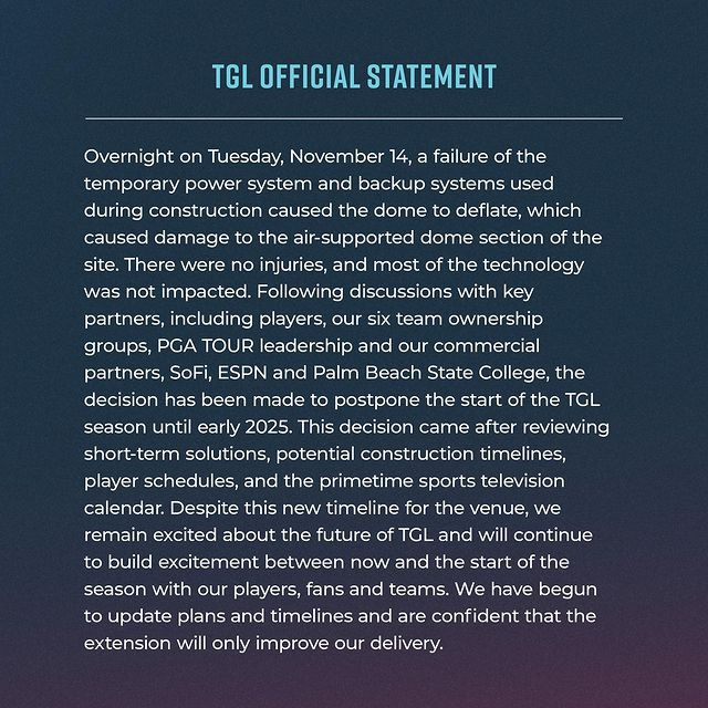 Mike McCarley, Co-Founder and CEO, TMRW Sports: “We are disappointed with the delay but thankful that no one was injured and grateful for the overwhelming support from our athletes, teams, Palm Beach State College and business partners. Their steadfast belief in the success of TGL and their alignment with the decision to postpone the inaugural season will allow us to regroup and return with the best product possible at our preferred time on the sports calendar.”