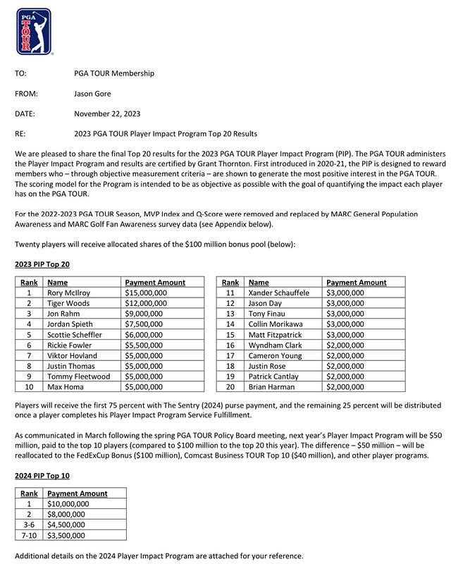 Rory McIlroy is the winner of the PGA Tour’s 2023 Player Impact Program, which came with a handsome $15 million payday. The results were released to players on Wednesday in a memo from PGA Tour VP and chief player officer Jason Gore, a copy of which was published publicly by Nate Lashley.